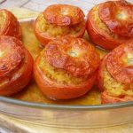 4. Mettre le risotto obtenu dans les tomates vidées.  Placer les chapeaux sur les tomates farcies.  Les placer dans un plat allant au four.  Les faire chauffer au four à 200 °c pendant 20 minutes.  Servir chaud.