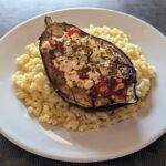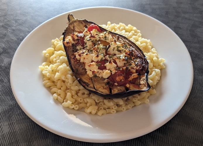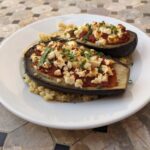 Recette simplifié : Couper l’aubergine en deux dans le sens de longueur. À l’aide de la pointe d’un couteau, quadriller la chair. Faire cuire au four à 200 °c jusqu’à ce que la chair de l’aubergine soit tendre. Appuyer la chair avec une cuillère. Dans le creux des aubergines, mettre la sauce tomate et parsemer de la feta émiettée. Passer les aubergines au four.