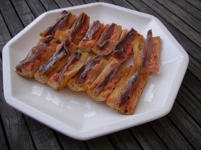 * Version de Cathy : Peler et épépiner les tomates.  Mixer la chair de tomates et tartiner les rondelles de pain (non grillé) avec cette purée.  (On n’utilise pas d’ail.)