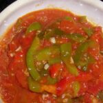 2 poivrons verts, 2 poivrons rouges, 4 gousses d’ail, 1 boîte de pulpe de tomates, 1 c. à soupe d’huile végétale, 1 morceau de sucre, 2 c. à soupe d’huile d’olive, 1 c. à soupe de cumin, 2 pincées de sel, 1 pincée de poivre blanc