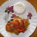 1/2 poulet coupé en morceaux, 400 g d’échine de porc, 2 poivrons rouges, 1 boîte (400 g) de pulpe de tomates en conserve, 3 oignons, 2 gousses d’ail, 1 tablette de bouillon de volailles, 1 pincée de sel, 1 pincée de poivre noir, 2 c. à soupe d’huile végétale