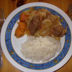 2. Faire chauffer l’huile dans une cocotte. Y faire dorer les morceaux de viande. Ajouter les oignons et l’ail. Faire revenir pendant quelques minutes. Y ajouter les tomates, le thym et les crevettes hachées. Saler et poivrer. Verser 1 verre d’eau et porter à ébullition. Couvrir et laisser mijoter pendant 2 heures à feu très doux. La viande doit être tendre en fin de cuisson.