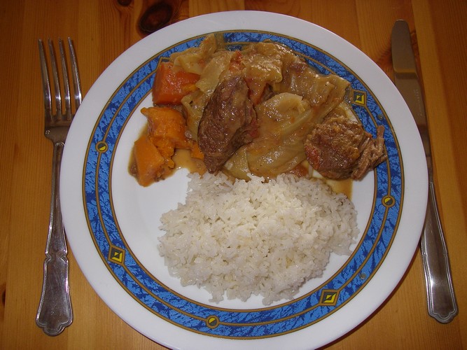1,5 kg de viande (mouton, agneau, bœuf ou poulet), 6 c. à soupe de pâte d’arachide, 2 oignons, 2 gousses d’ail, 5 tomates pelées et épépinées, 1 c. à soupe de crevettes séchées, 1 petit chou, 8 carottes, 4 petits navets ronds, 4 patates douces (ou pommes de terre), 10 cl d’huile d’arachide, 1 branche de thym, sel, poivre de Cayenne