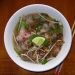 1,5 kg de bœuf plat de côte, 600 g de bœuf pour bourguignon, 2 oignons, 1 morceau (environ 50 g) de gingembre, 1/2 tête d’ail, 5 tiges de céleri, 2 c. à soupe de poudre de bouillon de poulet, 1 c. à café de sel, 3 c. à soupe de sauce soja, 1 c. à soupe de sauce nuoc-mâm, 1 navet long, 500 g de vermicelles de riz (pho), 400 g de bœuf à fondue