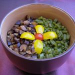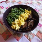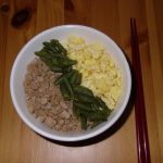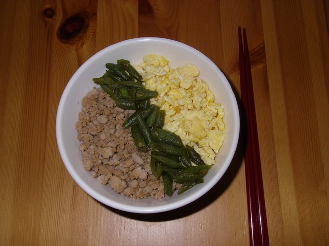 3 tasses de riz rond cuit, 200 g de blanc de poulet ou bœuf hachée, 3 œufs, 180 g de haricots verts (ou pois gourmands), 2 c. à soupe de saké, 4 c.à soupe de sucre, 4 c. à soupe de sauce soja, 20 cl de dashi (fumet de poisson ou d’algue japonais), 1 petit morceau de gingembre, sel, huile
