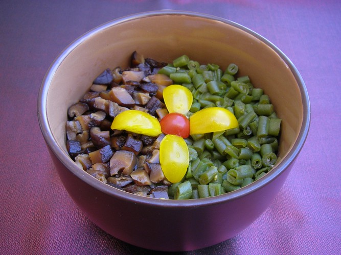 4. Préparer les haricots verts. Les faire blanchir dans l’eau bouillante salée. Les égoutter et les couper en lanières. Dans une petite casserole, mettre 20 cl de dashi, 1 c. à soupe de sauce soja, 1 c. à soupe de sucre et 1 pincée de sel. Porter à ébullition. Y plonger les haricots verts et laisser cuire sur le feu vif à découvert jusqu’à ce qu’il n’y ait plus de jus.