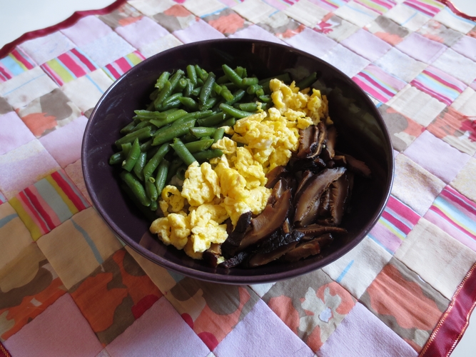 5. Répartir le riz dans 3 bols. Dessus, ranger joliment en lignes le poulet, les œufs et les haricots verts. Servir chaud, tiède ou à température ambiante.