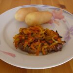 4. Verser la préparation aux légumes sur la viande. Faire cuire au four à 200 °c pendant 20 minutes. Servir chaud avec les pommes de terre cuites à la vapeur ou de la purée de pommes de terre.