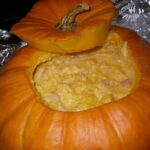 6. Enlever le chapeau et gratter la chair du potiron en la mélangeant avec la farce. Servir chaud.