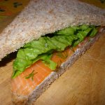 2. Poser sur chaque tranche de pain tartiné, 1 tranche de saumon fumé, un peu d’aneth, 1 feuille de batavia et terminer par une tranche de pain non tartiné. Couper éventuellement en deux. Servir frais.