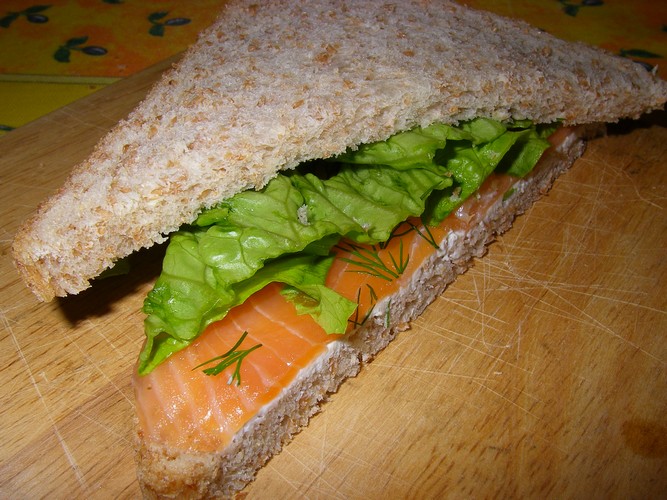 8 tranches de pain de mie complet, 4 grandes tranches de saumon fumé, 8 c. à soupe de fromage frais (St. Moret, Carré frais, etc.), 4 feuilles de batavia, 1 filet de jus de citron, 2 c. à café d’aneth