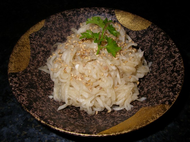 1 radis noir (environ 300 g), 1 c. à soupe de sel, 1 c. à soupe de sucre, 2 c. à soupe de vinaigre de riz, 1 c. à café de sauce soja, 1 c. à café de graines de sésame dorés