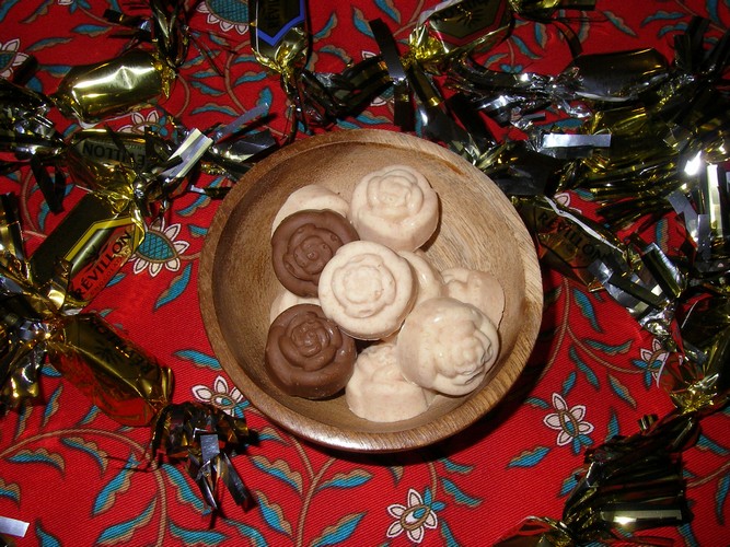 3. Verser la préparation dans des moules à chocolat. Laisser prendre dans un endroit assez frais (environ 15 °c) pendant quelques heures. (Ne pas mettre dans le réfrigérateur.)