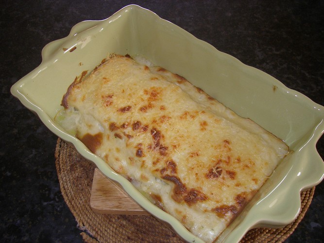 2. Verser un peu de la sauce béchamel dans un plat allant au four. L’étaler et dessus, ranger les quenelles. Dessus, verser la sauce béchamel restante. Terminer par le fromage râpé.