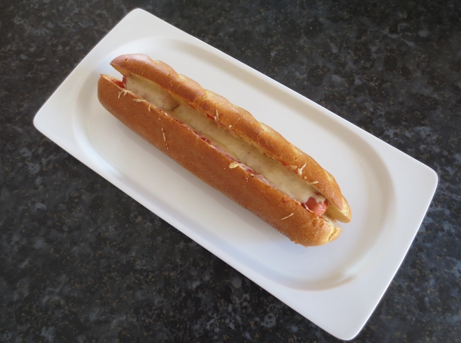 1 pain pour hot dog, 1 saucisse de Strasbourg ou de Francfort, 1 c. à soupe de ketchup, 2 c. à soupe de fromage (chedder ou emmental) râpé, 1 c. à café de moutarde