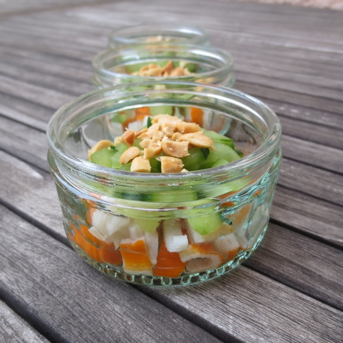 3. Couper les bâtonnets de surimi en petits morceaux et les répartir dans des petits verres. Dessus, placer la préparation au concombre. Terminer par les cacahuète concassés. Servir frais.