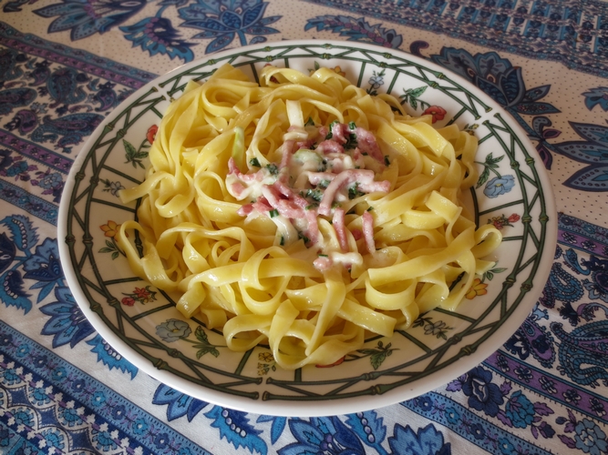 240 g de tagliatelles, 1 c. à soupe de farine, 3 c. à soupe de beurre, 20 cl de crème fraîche, 150 g de jambon blanc coupé en allumettes, 2 c. à café d’oignon vert ciselé, sel, poivre blanc
