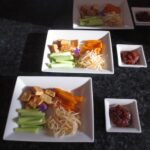 3 petits carottes, 100 g de pousses de soja, 1/2 concombre, 1 tofu ferme, 1 c. à soupe d’huile