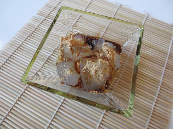 3. Lorsque la pâte et le sirop sont refroidi, les sortir du réfrigérateur. Couper la pâte en cubes avec un couteau mouillé. Répartir les cubes dans des coupelles de service. Saupoudrer de kinako et verser le sirop. Servir immédiatement.