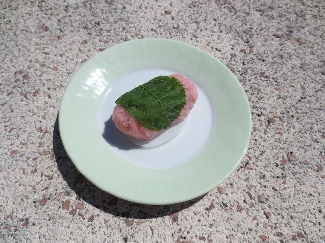 6. Prendre 1 portion de riz sur 1 carré de film alimentaire. Couvrir avec l’autre carré de film et aplatir le riz en utilisant un rouleau de pâtissier. Ôter le film alimentaire de la surface et mettre 1 portion de confiture de haricots azuki au milieu. Ramener le riz pour fermer et former une boulette allongé dans le film alimentaire. Sortir la boulette du film et coller 1 feuille de cerisier (côté lisser intérieur). Répéter cette opération pour obtenir 12 boulettes.