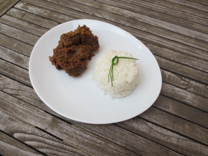 6. Ajouter la viande coupée en cubes d’environ 3 cm de côté. Faire revenir pendant 1 minute. Ajouter le lait de coco et porter à ébullition. Baisser le feu et couvrir à moitié. Laisser mijoter quelques heures à feu très doux, jusqu’à ce que la viande soit tendre et la sauce soit considérablement réduite.