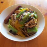 - Chauffer la moitié de l’huile dans une poêle. Y faire revenir les shiitakés et le poivron (environ 15 minutes).