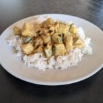 2 courgettes, 1 oignon, 20 cl de lait de coco, 1/2 tablette de bouillon de légumes, 1 c. à soupe de poudre de colombo, 1 c. à café de mélange de herbes pour barbecue (ou herbes de provence bien broyés), 1 c. à café de curcuma, 1 c. à soupe de ketchup, 1 c. à café de suriracha, 1 c. à soupe d’huile de tournesol