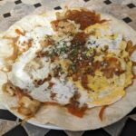 - Préparer une autre poêle. Y faire chauffer la moitié de l’huile restante. Casser 1 œuf et mélanger rapidement pour que le jaune se mêle un peu avec le blanc. Avant que l’œuf soit sec, verser la moitié de la préparation aux échalotes. Couvrir de la galette, en appuyant légèrement partout. Retourner sur une assiette. Répéter encore une fois la même geste et servir.