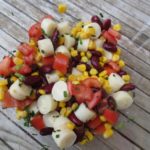 1 boîte de cœur de palmier en conserve, 100 g de haricots rouges cuites, 100 g de maïs en conserve, 1 c. à soupe d’oignon vert ciselé