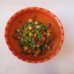 300 g de pois chiches cuits, 300 g de petits pois écossés, 2 beaux oignons, 1 gousse d’ail, 200 g de pulpe de tomates, 1/3 bouillon de légumes, 1 c. à café de cumin, 1 c. à café de graines de coriandre, 1 c. à café de curcuma, 2 c. à café de garam masala, 2 pincées de poivre de Cayenne, 2 c. à soupe d’huile végétale, poivre noir, sel