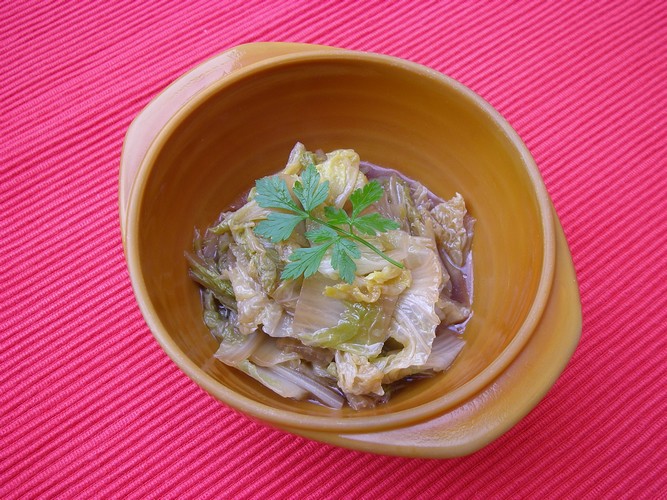 1/2 chou chinois, 1 c. à soupe de sauce soja, 1 c. à soupe de mirin, 3 c. à soupe de konbu dashi (bouillon japonais à la base d’algue), 1 c. à soupe d’huile végétale, du sel