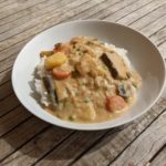 4 tasses de riz blanc cuit, 1 aubergine, 2 oignons jaunes, 3 carottes, 2 pommes de terre, 1 poignée de petits pois surgelés, 3 c. à soupe d’huile de tournesol, 1 tablette de bouillon, 1 c. à soupe de concentré de tomate, 2 c. à café de curry en poudre, 1 c. à café de garam masala, 1 c. à soupe de sauce soja, 20 cl de crème de coco, 1 c. à soupe de sucre brun, 2 c. à soupe de farine, sel
