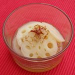 100 g de racine de lotus, 5 cl de konbu dashi, 1 c. à soupe de sucre, 2 c. à soupe de vinaigre de riz, 1 c. à soupe de vinaigre d’alcool, 1 pincée de sel