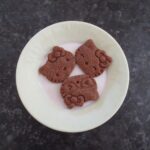4. Lorsque la pâte devient un peu dure, la sortir du congélateur. Enlever le film alimentaire et trancher la pâte en disque de 4 mm d’épaisseur. Les ranger sur une plaque de four couverte du papier sulfurisé. Coller les morceaux de wasanbon à la surface de chaque disque.