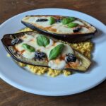- Remettre les aubergines au four et faire cuire jusqu’à ce que la mozzarella soit fondue. Parsemer des feuilles de basilic. Servir immédiatement.