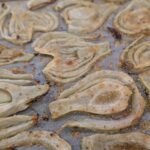 Version simplifié : Trancher le fenouil finement (3 mm d’épaisseur) et cuire directement au four. (On ne précuit pas.)