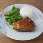 750 g de cuisses de poulet, 5 cl de sauce soja, 5 cl de vinaigre blanc, 1 c. à café de sucre complet, 2 gousses d’ail, 1 petit oignon, 1 feuille de laurier, 2 c. à soupe d’huile végétale, poivre noir