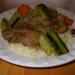 8. Répartir les graines de couscous dans des assiettes de service. Dessus, placer le canard et les légumes. Verser la sauce. Servir chaud, éventuellement avec de la harissa.