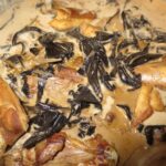 5. Ajouter la crème fraîche et les trompettes de la mort. Poursuivre la cuisson 20 minutes à découvert. Servir chaud.