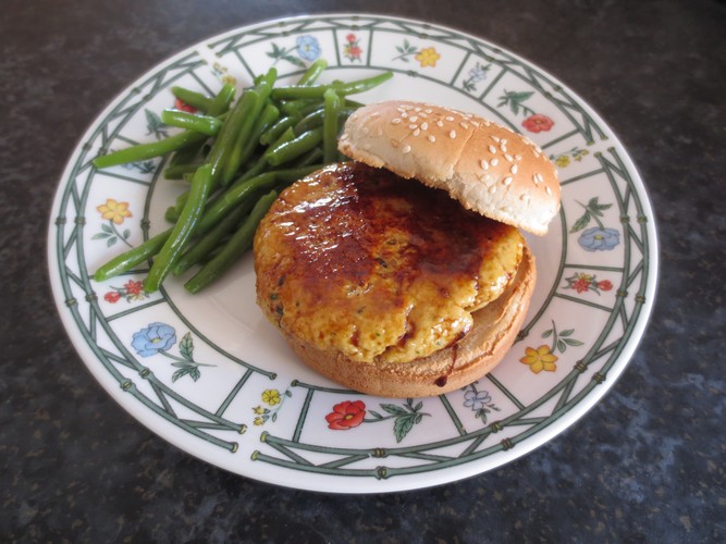 2 blancs de poulet, 1 œuf, 4 c. à soupe de chapelure, 1 c. à soupe de ciboulette ciselée, 4 pain pour hamburger, 2 c. à soupe d’huile végétale, sel, poivre, 3 c. à soupe de mirin, 2 c. à soupe de sauce soja, 1 c. à soupe de sucre