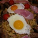 7. Mettre les pâtes avec la sauce dans une grande assiette de service. Dessus, poser les tranches de jambon, les tomates cerises, les boulettes et les œufs à plat. Servir immédiatement.
