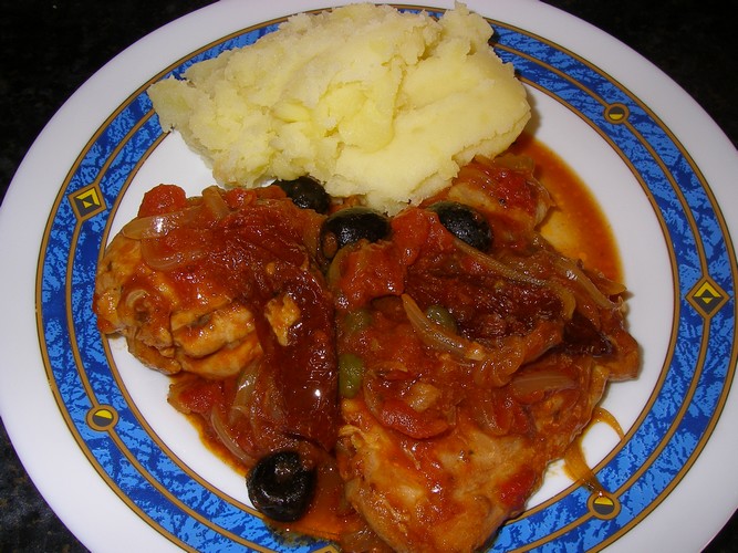 4 cuisses de poulet, 3 c. à soupe d’huile d’olive, 2 oignons, 2 gousses d’ail, 400 g de pulpe de tomates, 50 g d’anchois à l’huile, 4 tomates séchées, 2 c. à soupe de vinaigre balsamique, 1 c. à café d’origan, 1 feuille de laurier, 1 c. à soupe de câpres, 100 g d’olives noires, sel, poivre
